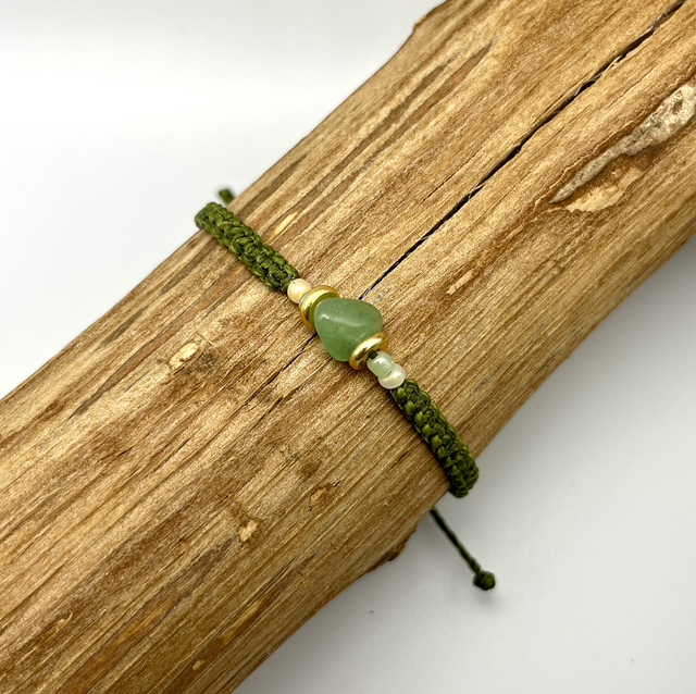 Das handgeknüpfte Macramé-Armband in tiefem Olivgrün trägt einen Aventurin-Stein als Symbol für Balance und Gelassenheit.