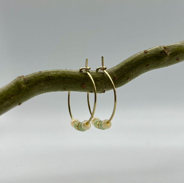 Die 18K vergoldeten Creolen greifen die Farbwelt mit feinen Perlen in Creme und Grün auf – ein stilvolles Duo, das Natürlichkeit und Eleganz perfekt verbindet.