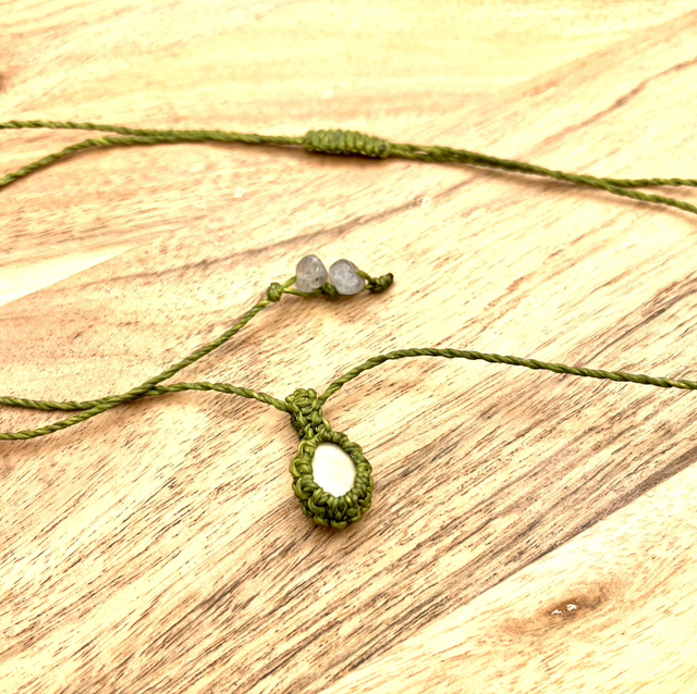 Diese grüne Kette ist im Makramee Verfahren geknüpft.