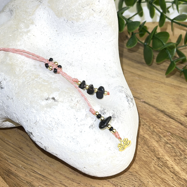 •verziert mit einem goldenen Lotus Anhänger, goldenen und schwarzen Perlen und schwarzen Schmucksteinen