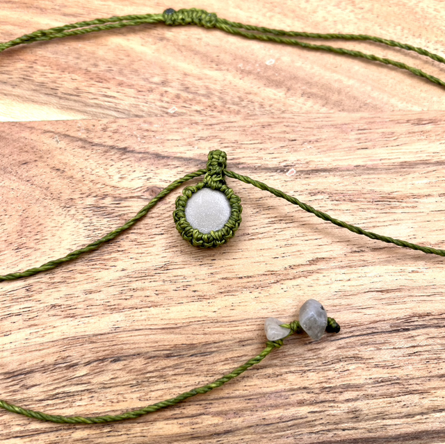 In diese einzigartige Makramee Kette ist ein runder Naturstein eingefasst.
