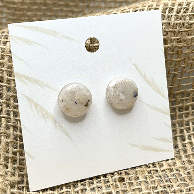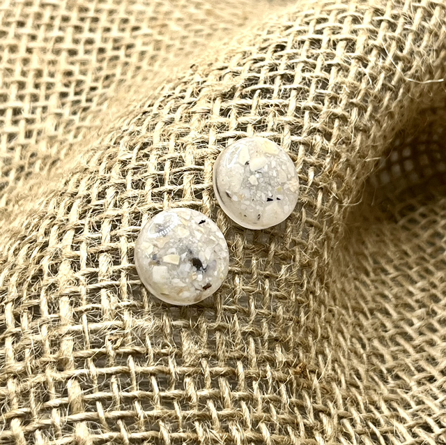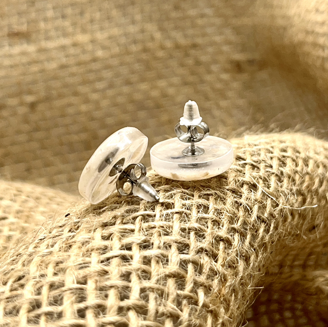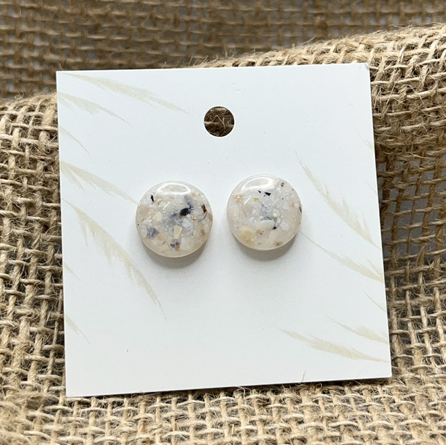 Diese runden Ohrstecker enthalten feinen Muschelsplitt, der im Resin eingebettet ist und für eine sanfte, organische Struktur sorgt. Durch die unterschiedlichen Farbnuancen entsteht bei jedem Paar ein ganz eigener Look – dezent, elegant und besonders.