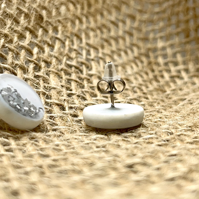 In das milchige Resin sind feine Aluminium-Splitter eingearbeitet, die je nach Licht dezent schimmern und jedem Paar eine individuelle Struktur verleihen. Minimalistisch, aber mit spannendem Effekt – perfekt für jeden Tag.